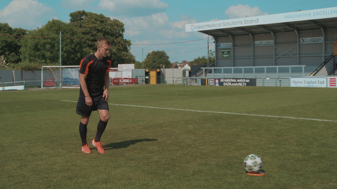 Place the ball (valve up), take a short angled run up and strike the spinning ball with the inside or outside of your foot, wrapping your foot around it so your kick follows the spin.